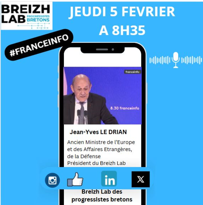 📻 Retrouvez Jean-Yves Le Drian, ancien ministre de la Défense et des Affaires étrangères et de l’Europe, Président du Breizh Lab, demain sur France Info.